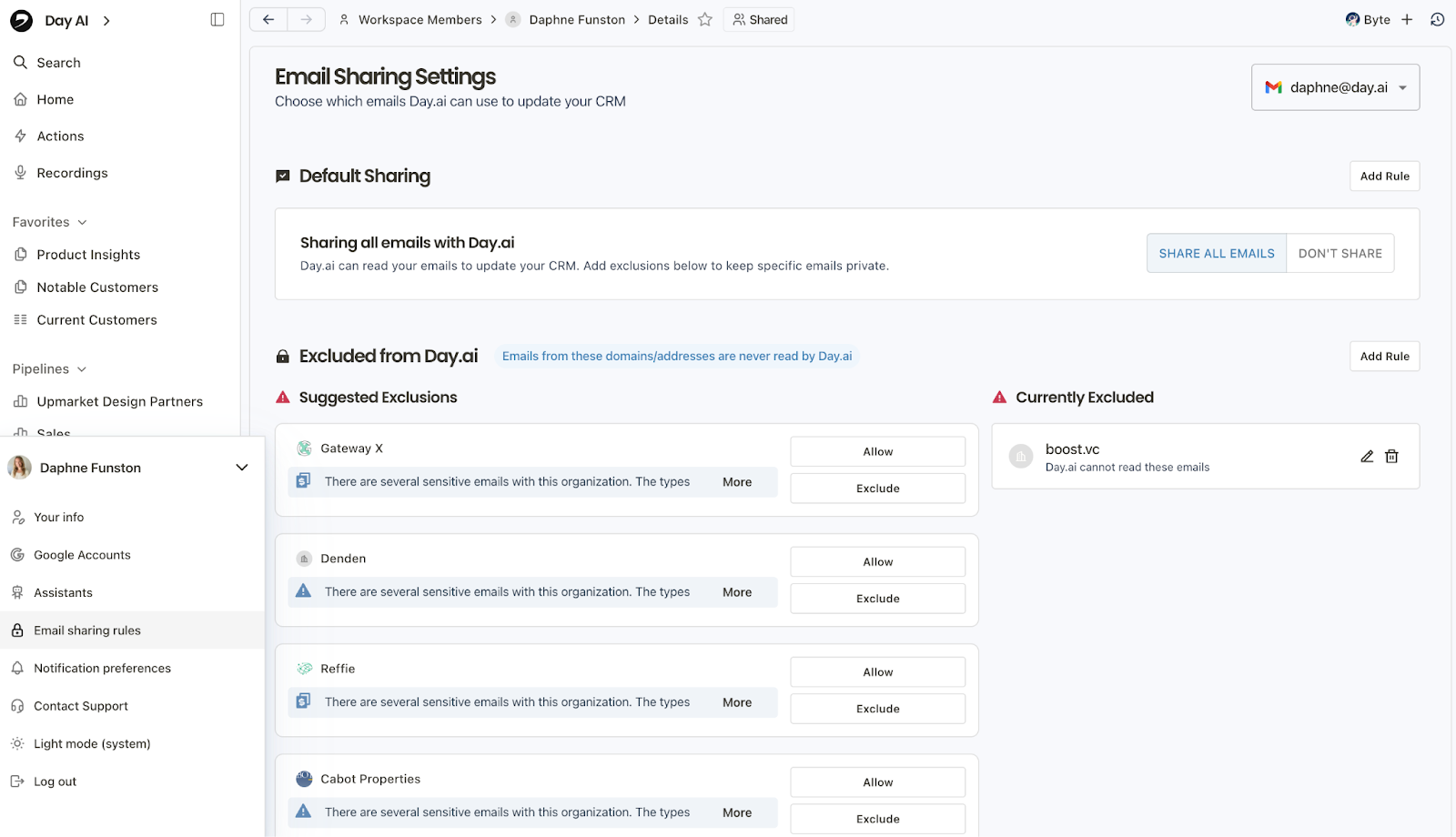 During email ingestion, Day AI will suggest sensitivity rules to protect private information. This goes beyond simple domain blocking—it uses AI to detect potentially sensitive content like HR discussions, investor communications, legal matters, and personal conversations.