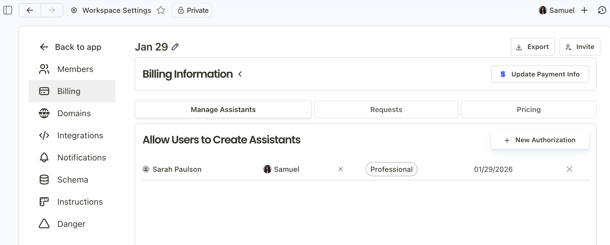 Authorizing Assistants: Owners can authorize Assistants for teammates in Workspace Settings → Billing. In the Manage Assistants tab, click "New Authorization”