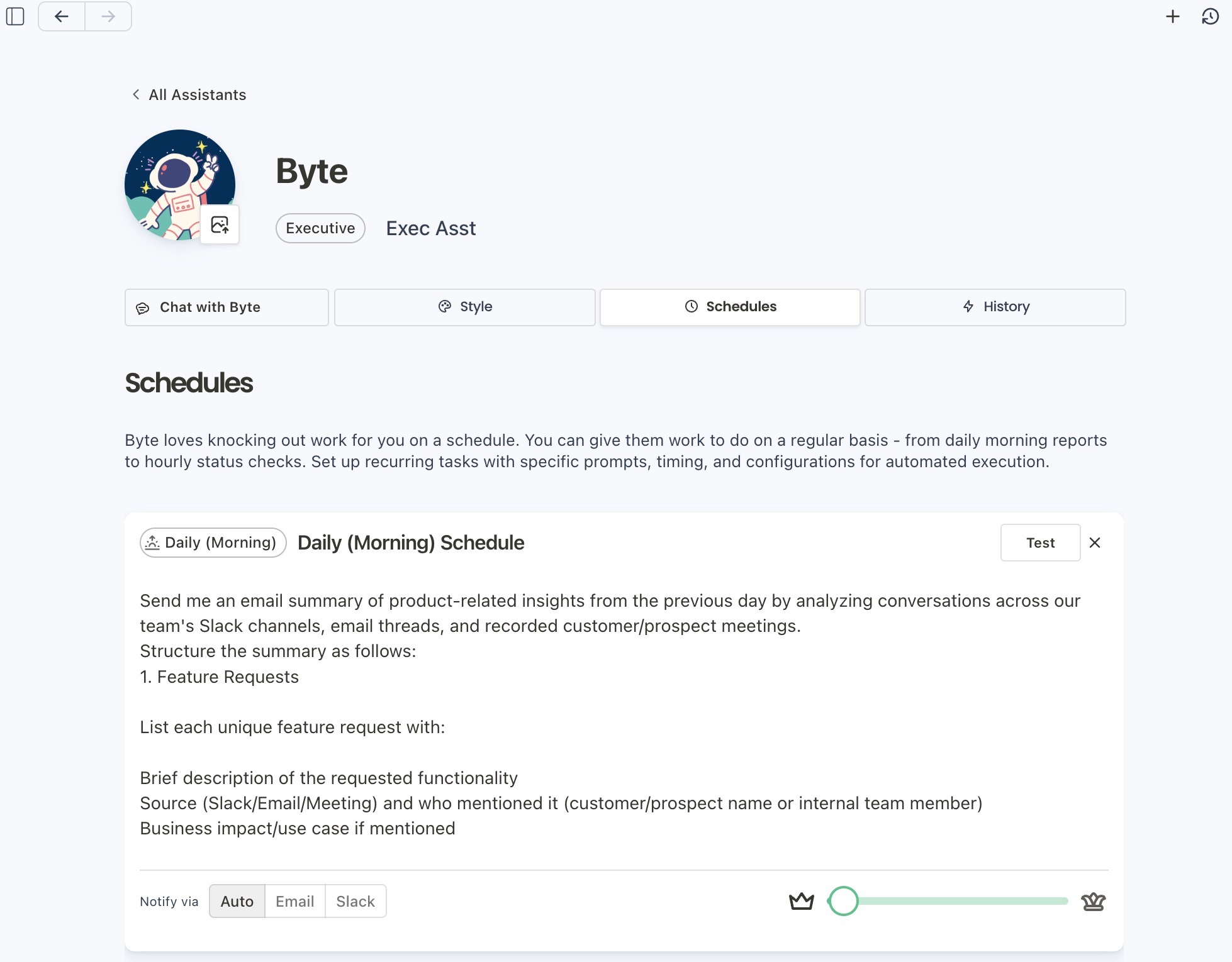 Your Assistant can send you regular briefings so you're always prepared. When creating a schedule, think beyond "what happened" to "what do I need to know to act." The best schedules surface insights, not just data.