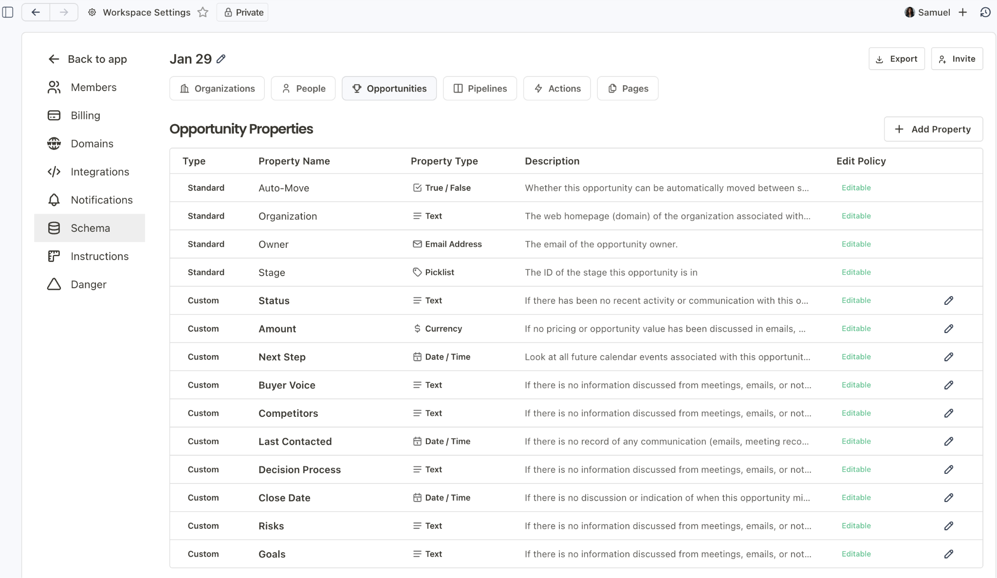 Day AI automatically populates your Opportunities with 10 Default Custom Properties for things most people want to track like Next Step and Close Date. You can edit the prompts for these Default Custom Properties to be tailored to your business, or delete those that are not necessary. We recommend starting with editing Amount and Close Date to be tailored to you.