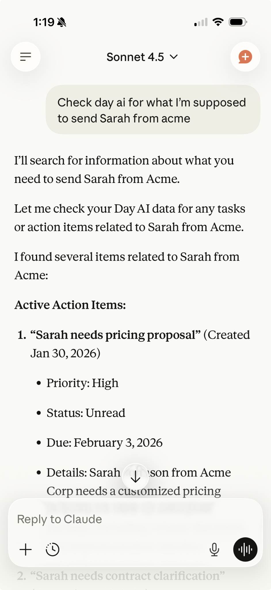 When you connect Day AI to Claude, you can query and update Day AI data from within Claude. Claude mobile becomes your Day AI mobile app. You can check on deals, add notes, or ask questions about your pipeline from anywhere.