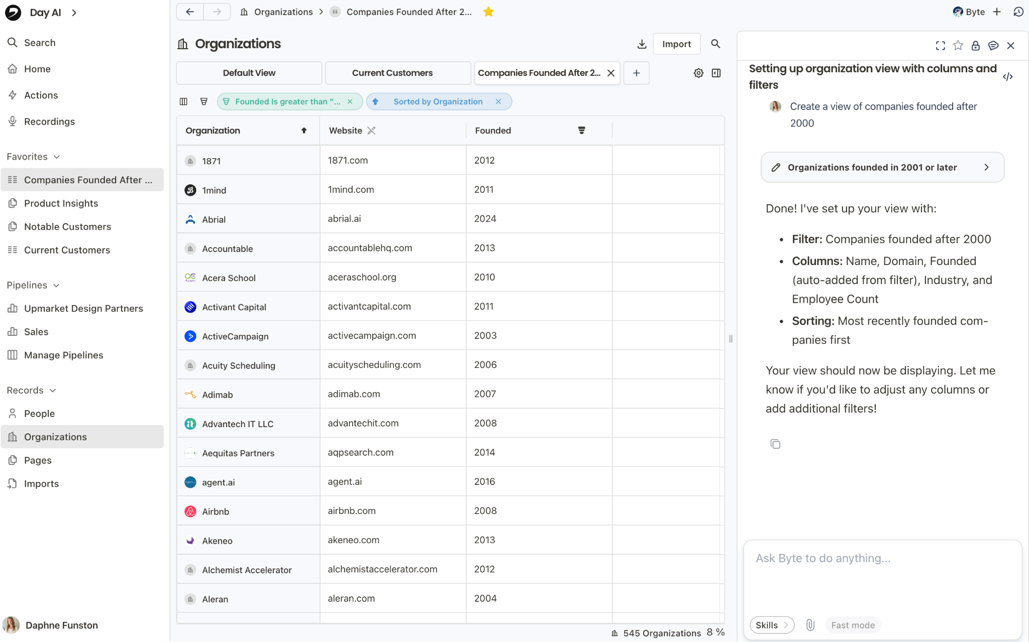 Custom properties let you track what matters to your business. Day AI can populate them automatically from CRM data (including conversational data), pull data from the web, or let you fill them manually.
