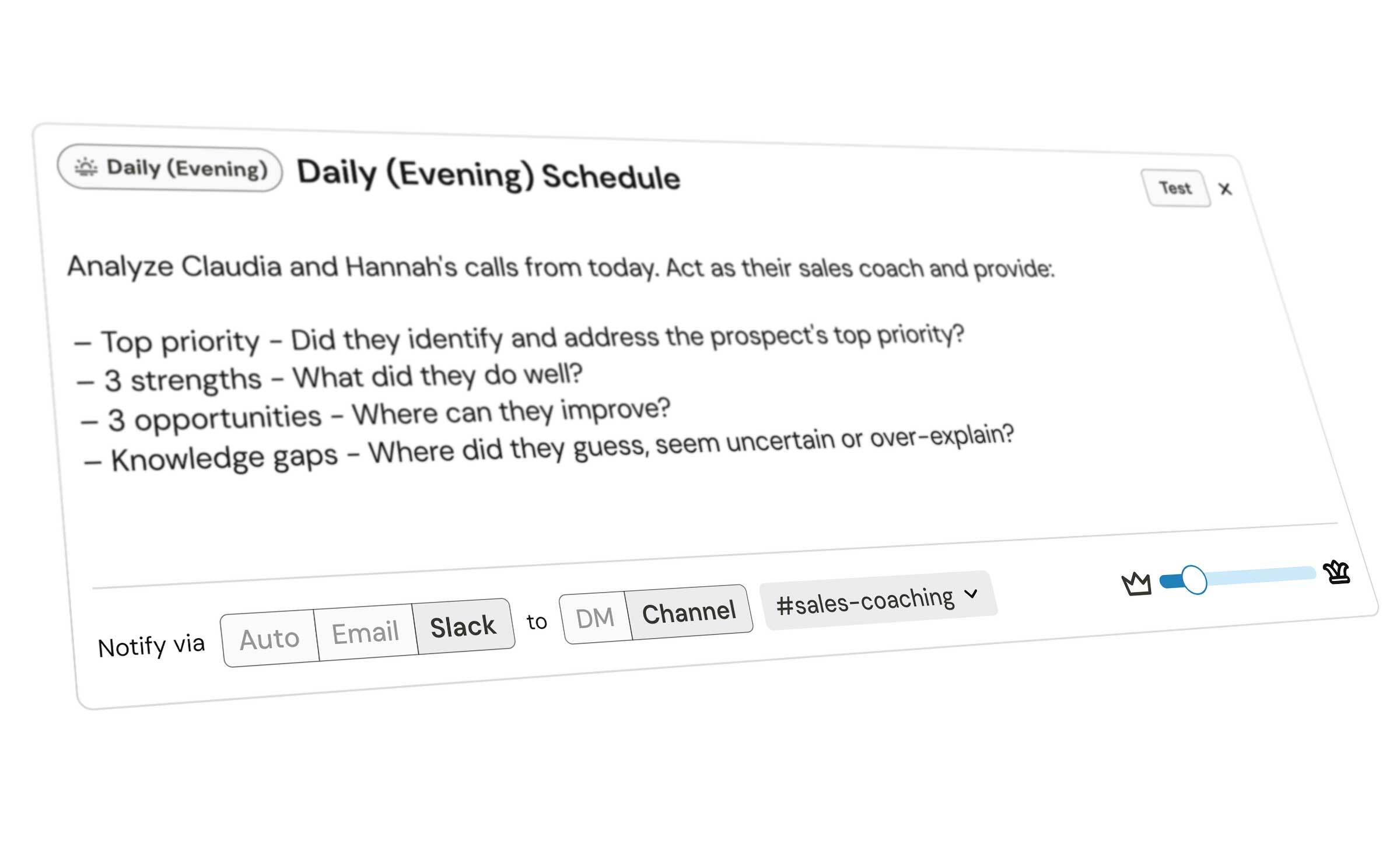 Your assistant's scheduled actions no longer get sent only to your inbox. Send them to any Slack channel – pipeline summaries to #sales, customer health reports to #customer-success, deal alerts to wherever your team is already paying attention.